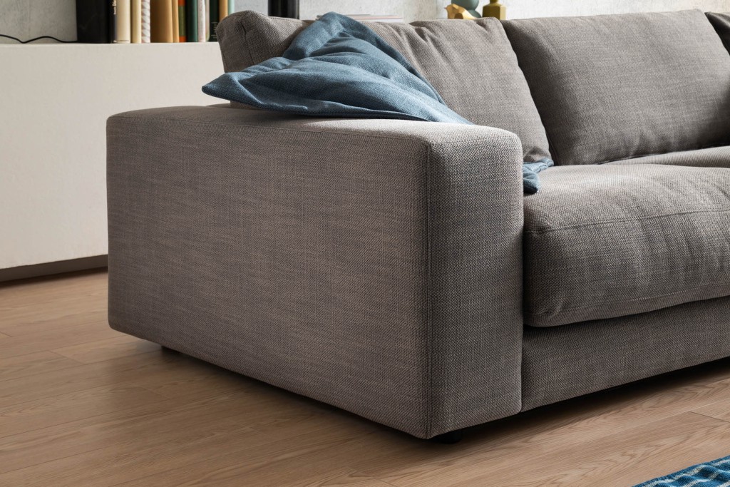 Velour, 100% Polyester, Farbe stone, Sitz lose Sitzkissen PUR-Schaum, Sitzhöhe 44 cm, Sitztiefe 84 cm, Rücken echt, Kunststoffgleiter, bestehend aus: