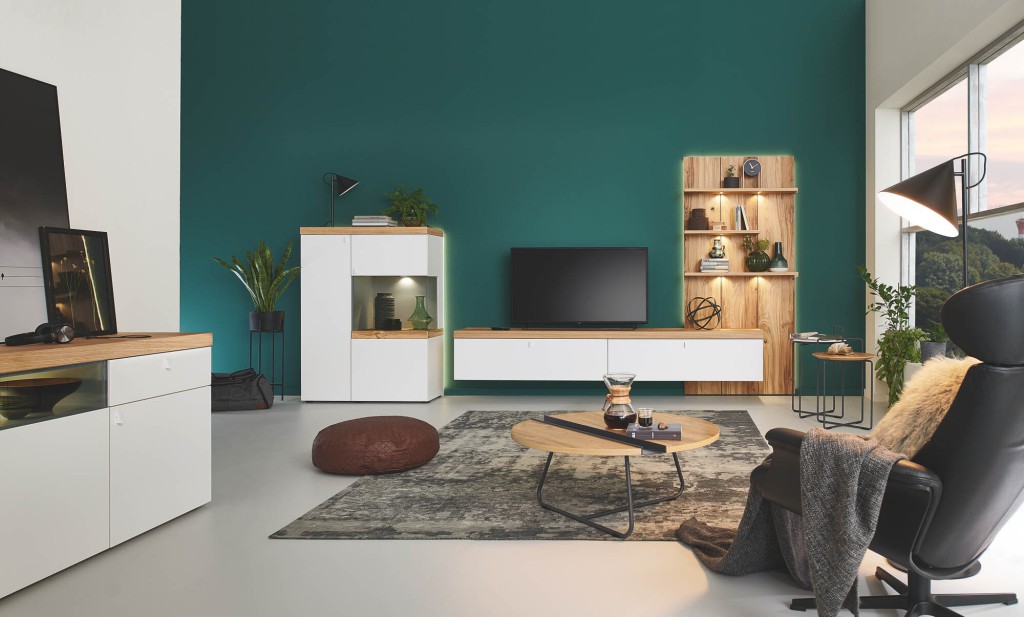 Lack kristallweiß matt, Eiche rustico hell geölt, Echtholz furniert, Beschläge mit Selbsteinzug und Dämpfung, Kombination, bestehend aus: