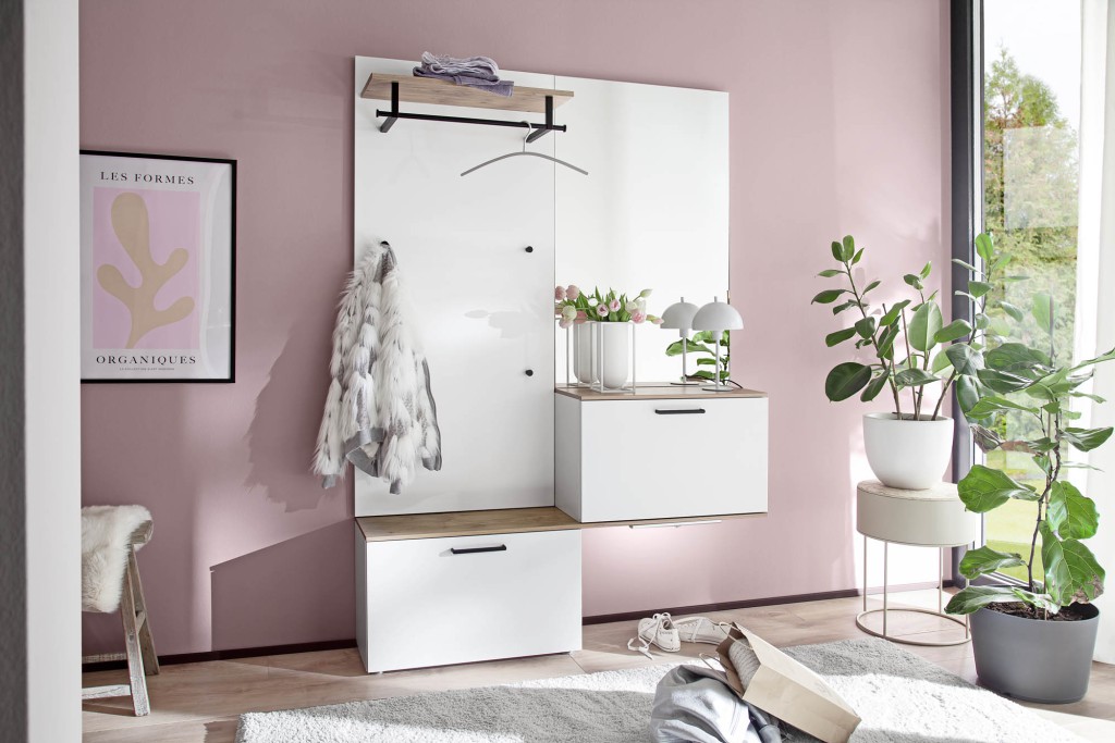 DielenkombinationWildeiche Bianco FurnierFronten grau LackGriffe-/Metallteile: schwarz mattbestehend aus:- Garderobenpaneel